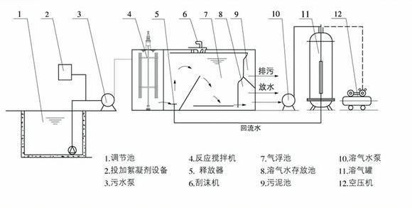 加壓溶氣氣浮在國內外應用廣泛,該法師將原水加壓至0.3~0.4MPA,同時通入空氣,使空氣溶解與水中並達到相應壓力狀態下的飽和值,然後驟然減至常壓,溶解於水中的空氣以微小氣泡的形式從水中釋放出來,氣泡直徑約為Ø20~Ø100μm左右,目前的基本流程有全部進水加壓溶氣氣浮、部分進水加壓溶氣氣浮、部分處理水回流加壓溶氣氣浮等三種,都是由加壓泵、溶氣罐、釋放器和氣浮池等基本設備組成。